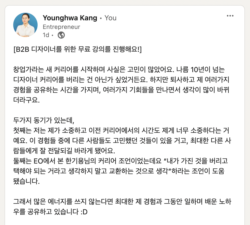 둘째로, 링크드인에 남긴 것 처럼 나는 내가 제일 소중하다는 거다. 이전 커리어에서의 시간도 나에게 너무 소중하다. 그 소중한 시간을 어떻게든 붙잡고 싶은 어떤 집착 같은 거랄까 😂 강의로 만들고 정리하면 남에게 설명해야하기 때문에 어떤 걸 모르는지 알 수 있다. 더 구조화해서 이해되고 진짜로 내 것이 된다.